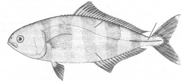 5 (6). Основание анального плавника короче расстояния между основанием брюшных и началом анального плавника и более чем в 1,5 раза короче основания второго спинного плавника; на хвостовом стебле вдоль боковой линии с каждой стороны по мясистому килю. Naucrates ductor (лоцман).