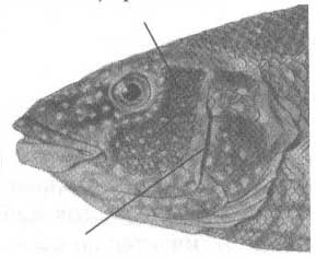 11 (10). Жаберная крышка не полностью покрыта чешуей, между голым участком, более или менее окрашенным, и задним краем предкрышки 1-2 ряда чешуй.