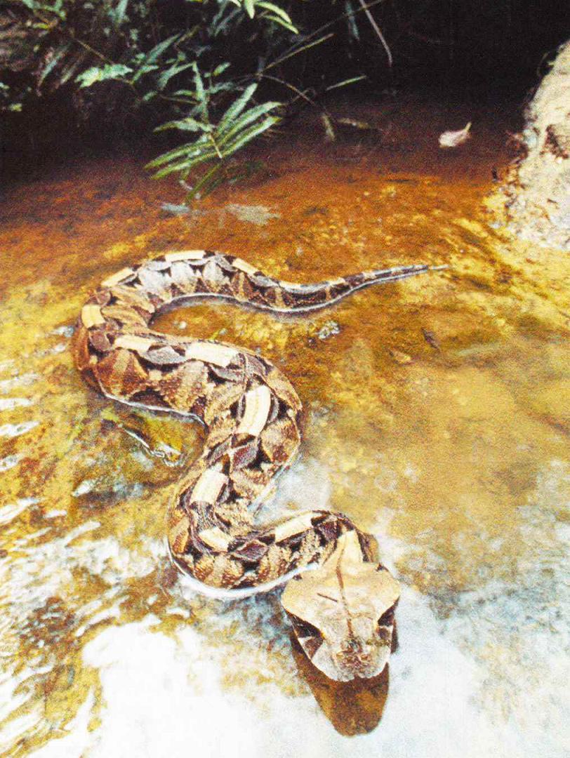Габонская гадюка любит принимать ванны в мелких прогретых солнцем водоемах.