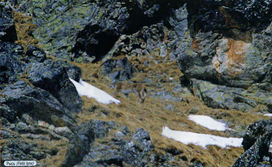 От седловины полез дальше, к скальному гребню. Там, метрах в пятистах туры малыми темными точками пасутся. Вот-вот за хребет перевалят. В бинокль их хорошо видно, одни козы, козлов нет. Подождал, пока они за хребет ушли. Поднимусь, думаю, к хребту, туры как на ладони будут. То ли высота стала сказываться, или устал сильно, только ползу как черепаха. Десяток шагов, отдышался — еще десяток, чем дальше, тем труднее, а до хребта еще метров триста. Еле живой добрался до хребта. Вправо уходит выгнутый амфитеатром крутой склон, отороченный сверху гребенкой остроконечных скал. Козы исчезли, видно, перевалили в соседнее ущелье. Шарю биноклем по склону. Перед глазами плывут бурые ковры прошлогодних трав да развалы камней. А вот и тур, серо-палевый, о четырех ногах. Нет, не похоже, больно плавно идет, лопатки на спине так и играют. Да это ж рысь! Крупная. До зверя метров триста. Пока дрожащими от усталости и волнения руками доставал аппарат, рысь к скалам подошла. Вот-вот среди них скроется. Щелкнул затвор, зверь услышал — на таком-то расстоянии. Вот это слух. Кошка остановилась, глядя в мою сторону. Секунд через пять отвернулась и пошла своей дорогой. Еще щелчок затвора, и зверь скрылся.